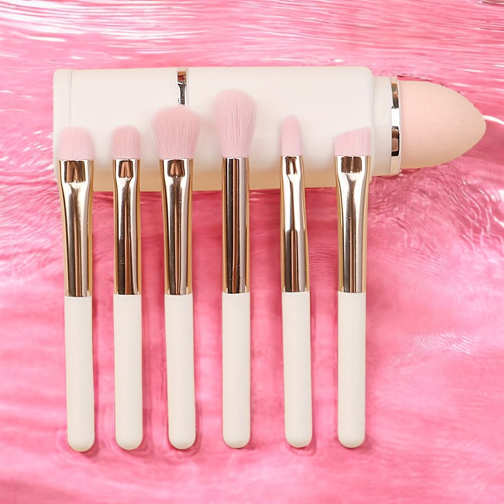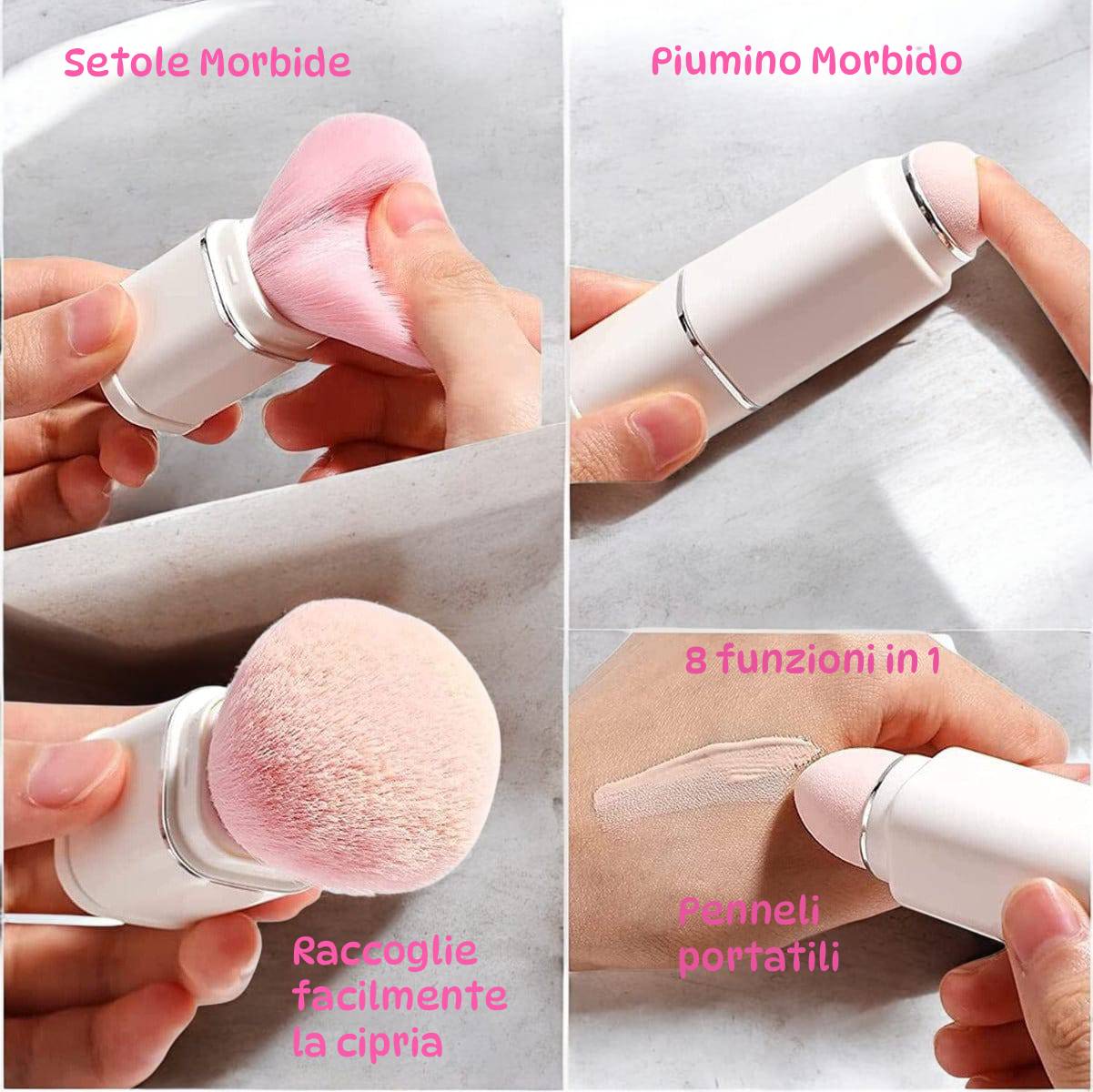 8 strumenti in 1: Un kit dove non manca nulla, include 6 Pennelli di precisione per gli occhi e labbra, un soffice pennello per blush e cipria e un beauty blender integrata per una base perfetta;